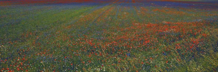 Melodía is the visualization of a metaphor for the Renaissance. A study of colors, harmonies, open, infinite spaces, in the blinding light of the sun that characterizes the entire series. It is a tribute to a unique place that no longer exists as we once knew it. Castellucio di Norcia is a small village in the Umbria region, in the heart of Italy. Surrounded by an extensive plain that between May and June becomes filled with flowers, expanding the impression of a poetic and inspiring place. When I immersed myself in it, in July, it was at an altitude of 1,452 meters. Since October 30th, 2016, its altitude has been reduced to 1,382 meters. A terrible earthquake demolished its homes and lowered the small mountain where this center of 150 souls had existed since the Middle Ages.