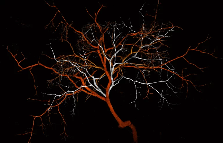 The tree, originally from a remote island in Cape Verde (Africa), fluctuates in a dark environment. The mystery opens up to its bright colors and shapes inspiring energy, life, passion. The complex fractal figure of our existence that now faces a post-human era (as a result of the great scientific discoveries of recent years), where rationality reaches the limits of our knowledge. A new era where human wisdom should prevail.