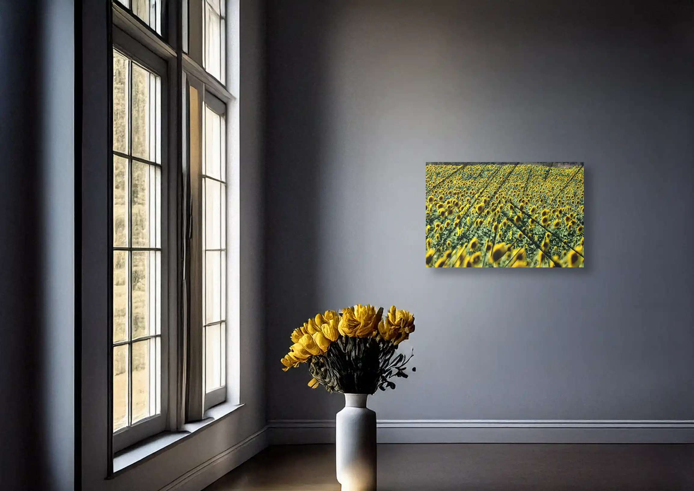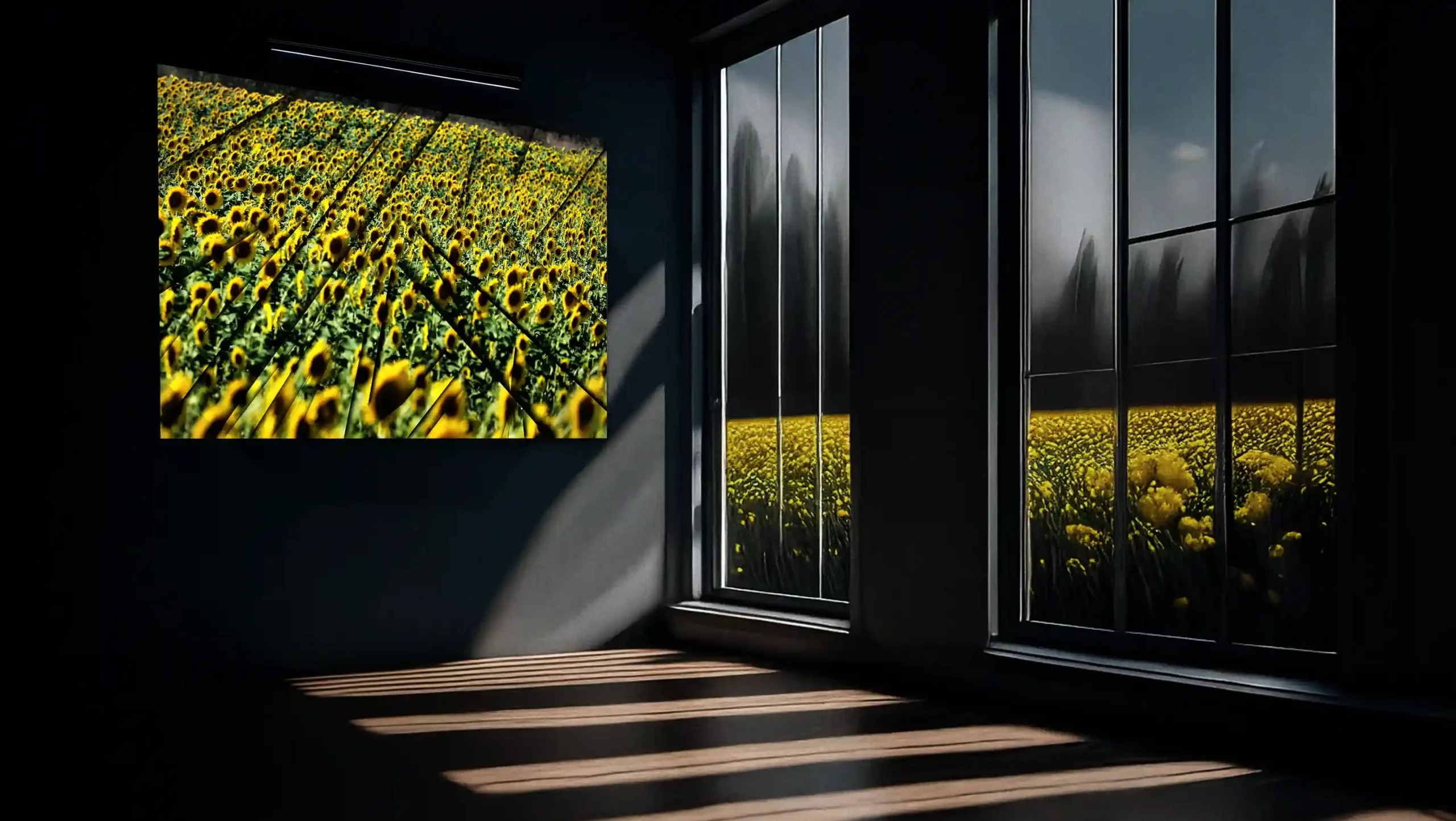 Terza Dimensione, Giallo Spaziale, 2025 se adentra en una experiencia tridimensional nacida de los fractales de los girasoles. La obra rompe deliberadamente el plano para generar una espacialidad que funciona como metáfora de una vivencia plena. El plano se quiebra y se accede a una experiencia directa de la realidad: una aparente destrucción que, como en la investigación espacial de Lucio Fontana, abre un nuevo orden perceptivo. No es ruptura por negación, sino por expansión. De ese gesto emerge una experiencia visual envolvente, abierta, potencialmente infinita.