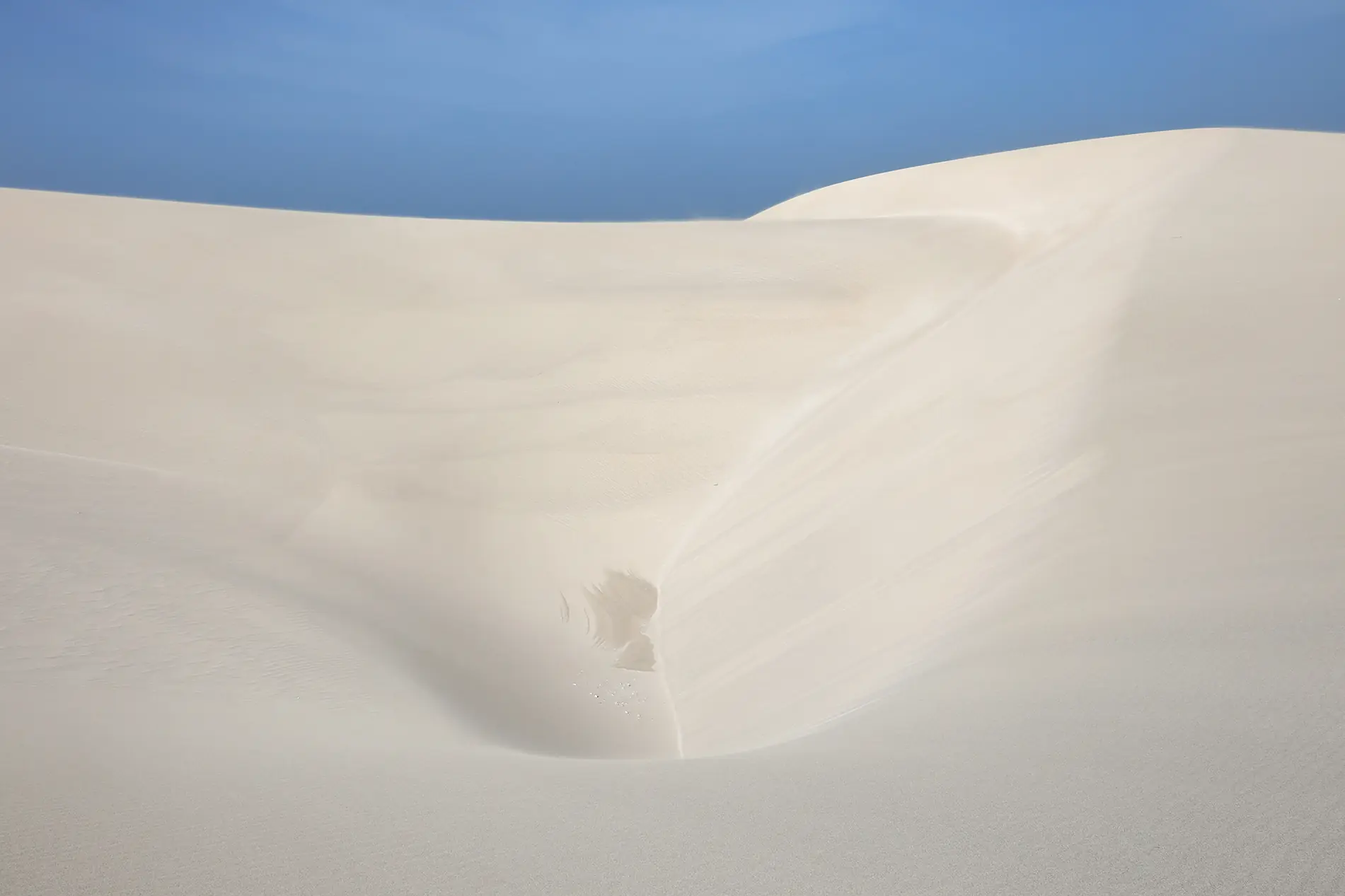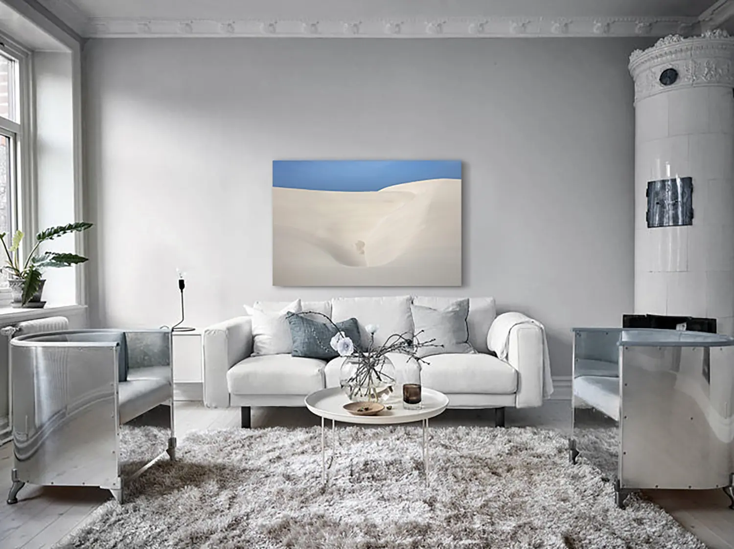 Si el propósito es mostrar lo invisible, esta obra es la representación del gesto sutil de la naturaleza. La caricia invisible del tiempo, que – leve – cambia, modela y nos muestra las delicadas olas, la elegancia del matiz, los colores sutiles. El blanco en sus múltiples libreas. La imaginación siente lo que ve. La intuición resulta un juego común. El cielo azul enmarca esta sensación, esta elegante seducción.
