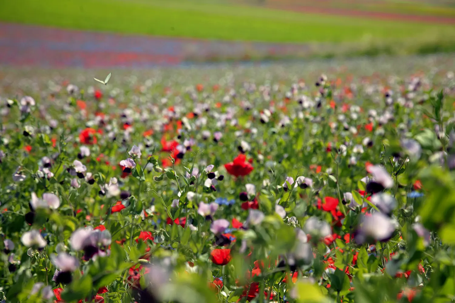 Es la visualización de una metáfora del renacimiento. Un estudio de colores, de armonías, de espacios abiertos, infinitos, en una luz cegadora del sol que caracteriza la serie entera. Es un homenaje a un lugar único que ya no existe de la forma en que lo conocíamos. Castelluccio di Norcia es una pequeña aldea de la región de Umbria, en el corazón de Italia. Rodeada por una extensa llanura que entre mayo y junio se llena de flores expandiendo la impresión de un lugar poético e inspirador. Cuando me sumergí en ella, en julio, se encontraba a una altura de 1.452 metros. Desde el 30 de Octubre del 2016, su altura se redujo a 1.382 metros. Un terrible terremoto ha demolido sus casas y ha bajado 70 centímetros el pequeño monte donde se había creado este centro de 150 almas en la Edad Media.